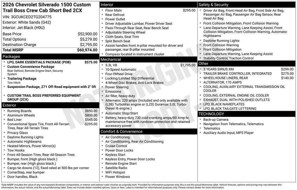$5,352 off MSRP! 2026 White Sands Chevrolet Silverado 1500 Custom Trail Boss 10-Speed Automatic 10-Way Power Driver Seat with Lumbar, 120-Volt Bed Mounted Power Outlet, 120-Volt Interior Power Outlet, 170 Amp Alternator, 220 Amp Alternator, 3 Years SiriusXM, 3.5 Monochromatic Display Driver Info Center, 4-Wheel Disc Brakes, 40/20/40 Front Split-Bench Seat, 6 Speakers, 6-Speaker Audio System, 6 Rectangular Black Tubular Assist Steps, ABS brakes, Air Conditioning, All-Weather Floor Liner, Alloy wheels, AM/FM radio: SiriusXM, Apple CarPlay/Android Auto, Auto High-beam Headlights, Auto-Locking Rear Differential, Automatic Emergency Braking, Auxiliary External Transmission Oil Cooler, Black Name Plates, Black Tailgate CHEVROLET Lettering, Bluetooth® For Phone, Brake assist, Chevytec Spray-on Black Bedliner, Cloth Seat Trim, Color-Keyed Carpeting Floor Covering, Compass, Custom Convenience Package, Dark Essentials Package, Deep-Tinted Glass, Delay-off headlights, Driver door bin, Driver vanity mirror, Dual Exhaust with Polished Outlets, Dual front impact airbags, Dual front side impact airbags, Dual Rear USB Ports (charge Only), Electric Rear-Window Defogger, Electronic Cruise Control, Electronic Stability Control, Emergency communication system: OnStar, External Engine Oil Cooler, EZ Lift Power Lock and Release Tailgate, Following Distance Indicator, Forward Collision Alert, Front anti-roll bar, Front Center Armrest w/Storage, Front Pedestrian Braking, Front reading lights, Front Rubberized Vinyl Floor Mats, Front wheel independent suspension, Fully automatic headlights, HD Rear Vision Camera, Heated door mirrors, Heavy-Duty Air Filter, Hill Descent Control, Hitch Guidance, Illuminated entry, Integrated Trailer Brake Controller, IntelliBeam Automatic High Beam on/Off, Lane Keep Assist with Lane Departure Warning, LED Cargo Area Lighting, Low tire pressure warning, Manual Tilt Wheel Steering Column, Occupant sensing airbag, OnStar Services Capable, Outside temperature display, Overhead airbag, Overhead console, Panic alarm, Passenger door bin, Passenger vanity mirror, Performance Red Recovery Hooks, Power door mirrors, Power driver seat, Power Front Windows with Driver Express Up/Down, Power Front Windows with Passenger Express Down, Power Rear Windows with Express Down, Power steering, Power windows, Preferred Equipment Group 2CX, Premium audio system: Chevrolet Infotainment 3, Radio data system, Radio: Chevrolet Infotainment 3 System, Rear 60/40 Folding Bench Seat (folds Up), Rear reading lights, Rear Rubberized-Vinyl Floor Mats, Rear step bumper, Rear Wheelhouse Liners, Rear window defroster, Remote Keyless Entry, Remote keyless entry, Remote Vehicle Starter System, Security system, Single Outlet Exhaust, SiriusXM Trial Subscription, Speed control, Speed-sensing steering, Split folding rear seat, Standard Tailgate, Suspension Package, Tachometer, Teen Driver, Theft Deterrent System (unauthorized Entry), Tilt steering wheel, Tire Pressure Monitoring System, Traction control, Trailering Package, Trip computer, Variably intermittent wipers, Voltmeter, Wheels: 18 x 8.5 Black Painted Aluminum, Wheels: 20 x 9 High Gloss Black Painted Aluminum, Wi-Fi Hot Spot Capable. Price includes: $1500 - Bonus Cash. Exp. 04/30/2026 $4250 - Customer Cash. Exp. 04/30/2026 Price includes $398 dealer added accessories.
