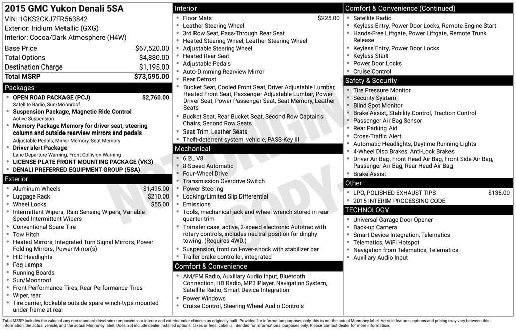 **For Sale: 2015 GMC Yukon Denali with features such as *Heated front seats*, *Cruise control/Speed control*, *Bluetooth®/Hands free phone*, *Remote vehicle start*, *Rear view camera*, and much more listed below!!**