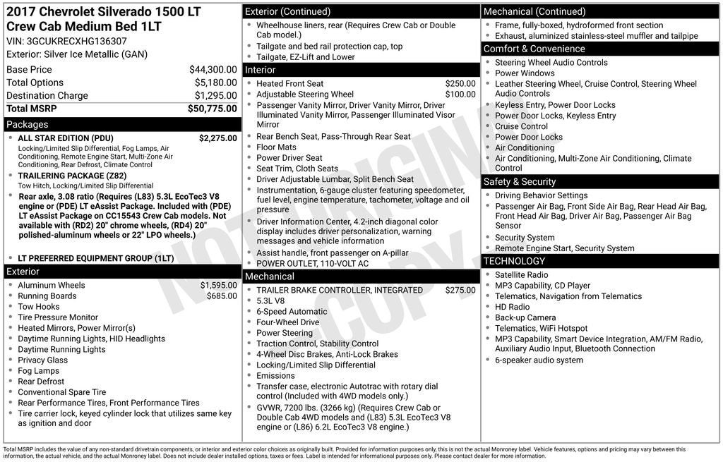**For Sale: 2017 Chevrolet Silverado 1500 LT with features such as *Heated front seats*, *Bluetooth®/Hands free phone*, *Cruise control/Speed control*, *Remote start*, *Rear view camera*, and much more listed below!!**Check out this **2017 Chevrolet Silverado 1500 LT**, a rugged and dependable full-size pickup truck that delivers power, capability, and modern features for work or play. Perfect for towing, hauling, or everyday driving, the Silverado 1500 LT combines reliability with comfort and style.Its **20-inch wheels** and full-size pickup profile provide a confident stance, ample cargo space, and a durable bed for all your hauling needs. Stay connected with an **8-inch touchscreen with **Bluetooth®/Hands free phone**, giving you easy access to navigation, music, calls, and essential vehicle controls. Added comfort and convenience features include **Heated front seats**, **Remote Keyless entry**, **Remote start**, and **Cruise control/Speed control**, making every drive more comfortable and enjoyable.The interior provides supportive seating, intuitive controls, and spacious legroom, ideal for long drives or workdays. Under the hood, this Silverado is powered by a **Reliable V6 or V8 engine option**, offering strong towing and hauling capabilities, along with smooth performance for everyday driving.With its **Bold styling, durable performance, modern technology, and comfort features**, this 2017 Chevrolet Silverado 1500 LT is a fantastic choice for anyone looking for a capable and hardworking full-size pickup truck. Visit **Lavery Automotive** or call **(330)-800-4048** to schedule your test drive today!Recent Arrival! If you are interested in shopping for a vehicle please send us an email, call or chat. We can use video and provide you all the information you need without coming into the dealership. Our Internet Sales team can help you gather information remotely. We can arrange for you to test drive the vehicle at your home (within proximity to our dealership) If you do decide to purchase we can DocuSign or deliver the vehicle to you or arrange an appointment to pick it up at the dealership. Check out on Google our 5 star reviews from real customers! Completely satisfied with their buying experience.Though we try our best to remove vehicles when sold please confirm information and availability before making a purchase decision.Awards:* 2017 KBB.com 10 Most Awarded BrandsDealership is not responsible for clerical, computer generated or data entry errors as it relates to vehicles, prices,equipment or incentives. Though we try our best to remove vehicles when sold please confirm information and availability before making a purchase decision.